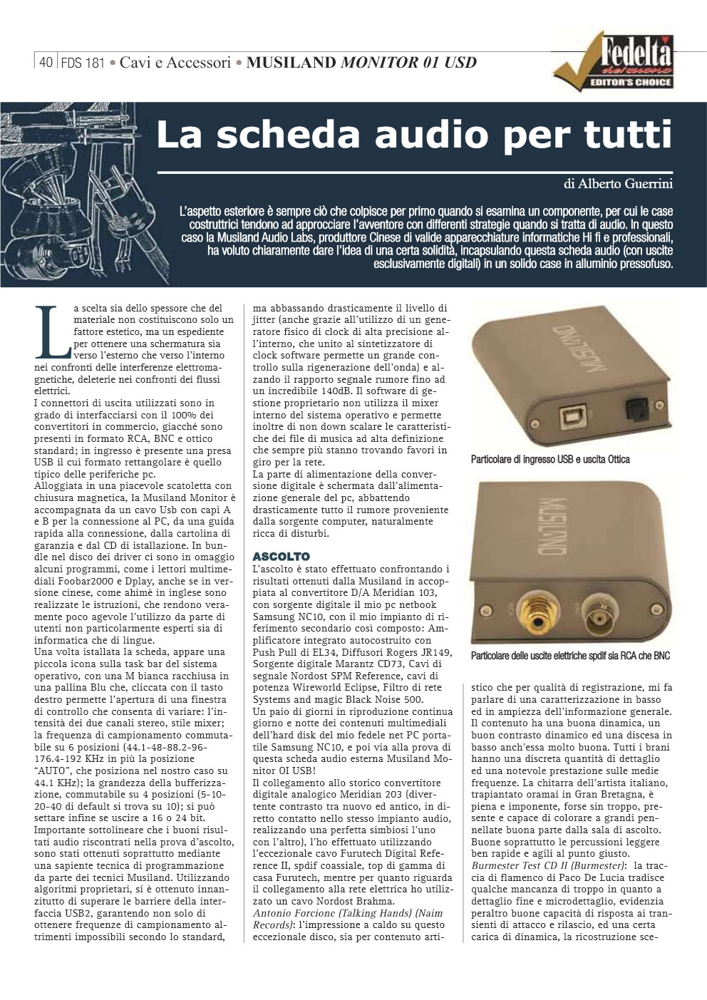 乐之邦Monitor 01 USD 获意大利《Fedelta del Suono》媒体推荐