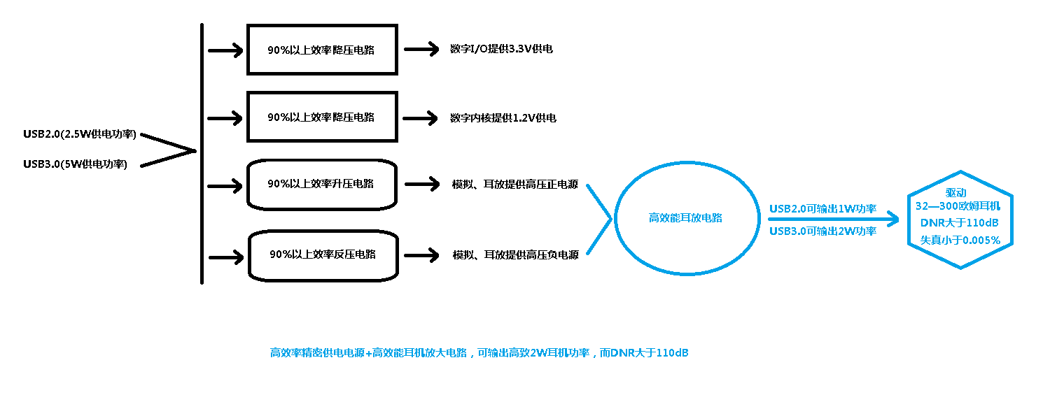 高效率DC-DC降压、升压、反压电路技术的研究和发展,使得90%以上效能的实际可用电路得以实现。借助此类电路,可以压榨USB 90%以上供电功率,应用于各部分电路。升压和反压供电电路,又能给模拟音频电路提供足够高的电压,从而提升音频输出电平和功率。实际测定,在USB2.0供电时,可以输出高至1W的音频功率来驱动耳机,而USB3.0供电时,可以输出高至2W的音频功率来驱动耳机。
