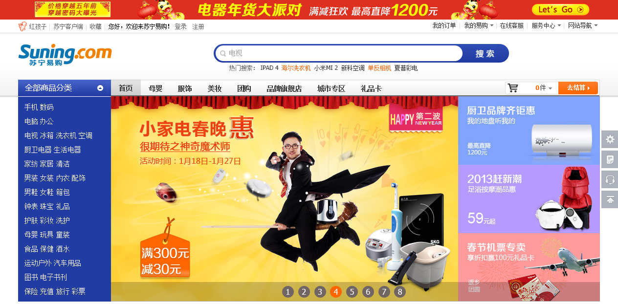 苏宁易购,是苏宁电器(A股股票代码:002024)旗下新一代B2C网上购物平台(www.suning.com),现已覆盖传统家电、3C电器、日用百货等品类。2011年,苏宁易购将强化虚拟网络与实体店面的同步发展,不断提升网络市场份额。未来三年,苏宁易购将依托强大的物流、售后服务及信息化支持,继续保持快速的发展步伐;到2020年,苏宁易购计划实现3000亿元的销售规模,成为中国领先的B2C平台之一。