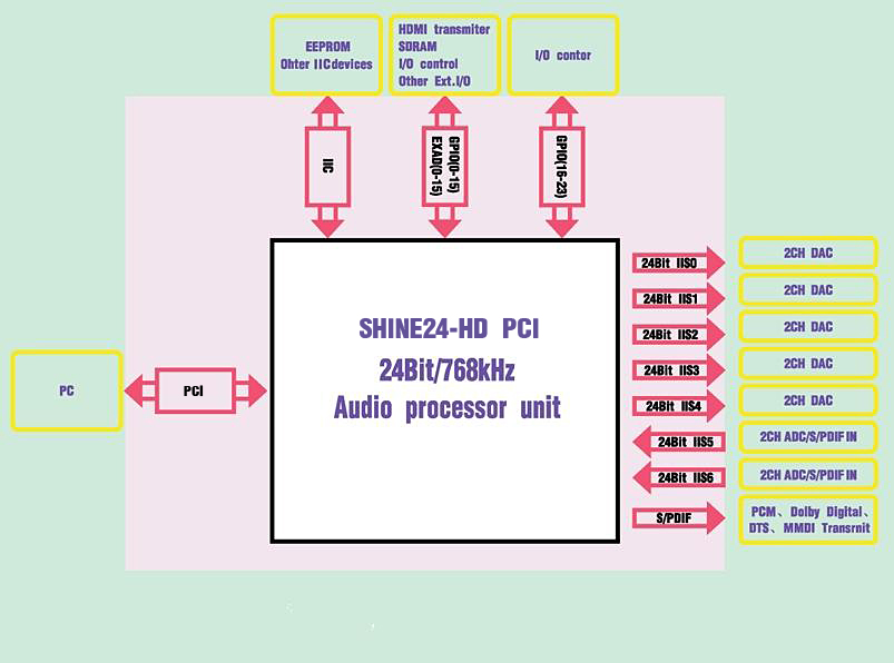 SHINE24-HD PCI高清音频芯片组具有I2C接口,可通过系统驱动控制外围ADC/DAC,16Bit的外围扩展总线,可以外加SDRAM用来完成大量实时存储的算法,或者连接其他APU实现诸如HDMI接口、无线通讯等功能扩展。