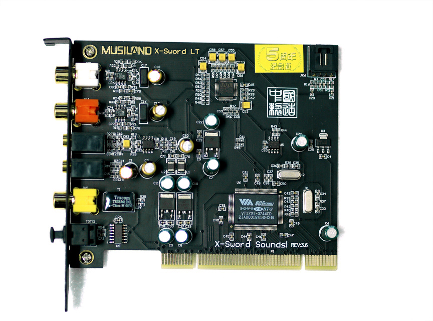 乐之邦轩辕LT 5周年版 PCI声卡产品是面向高质量音乐欣赏、游戏以及其它家庭娱乐用途的PCI声卡。本产品采用了威盛Envy24专业音频控制芯片以及Wolfson 高级音频编解码器,配以乐之邦精湛的电路设计,使得本产品拥有高水准的音效保真度和若干最佳特性。使用本产品连接优质立体声音响系统和AV音响系统,您可以领略到高保真素质的音乐效果以及极具震撼力的DVD电影音效和游戏环境音效。
