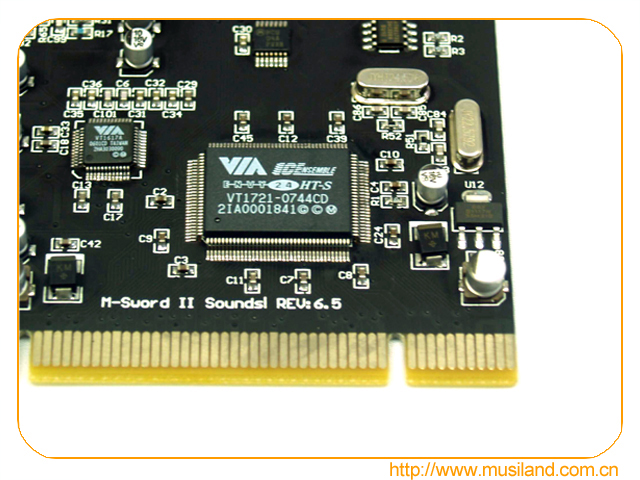 M-Sword II 7.1声卡采用了双晶振时钟源设计,配合威盛Envy24专业音频控制芯片,完全避开了采样率转换(SRC)过程,最大程度的保证了音频回放的保真度。