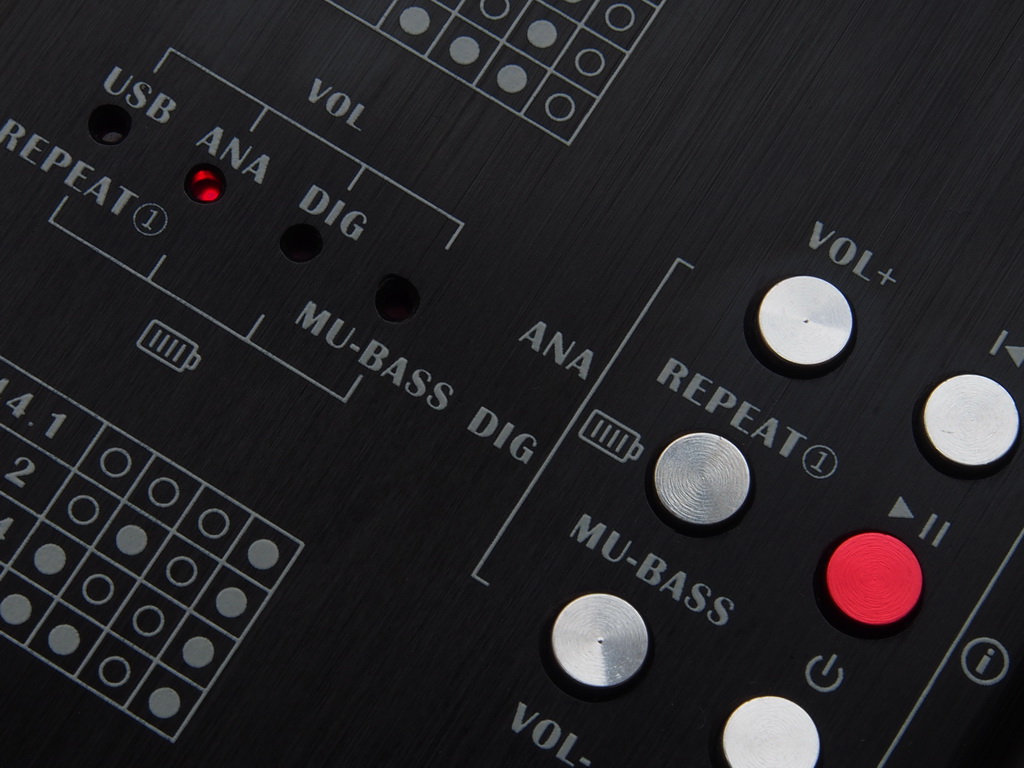 多功能按键搭配智能显示,完成播放、音量、电量检测、采样率检测、MU-BASS、循环播放等众多功能的调节。