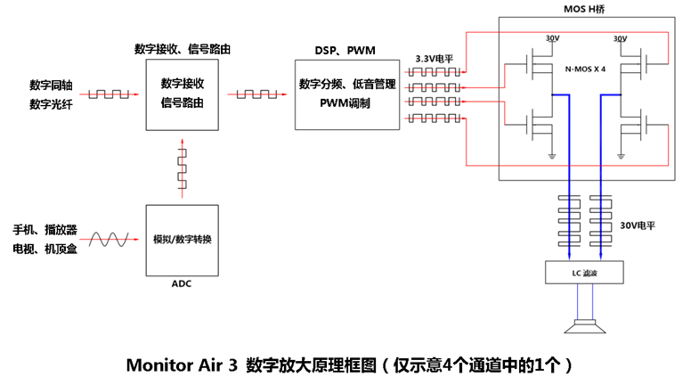 Monitor Air系列全数字智能多媒体音箱主要的设计目的,是为数字电视机顶盒、智能手机提供高清音频(HD Audio)所需要的回放性能和音质,具备全数字输入接口(数字光纤和同轴)和全数字放大,以及HI-FI级别的高保真喇叭单元。